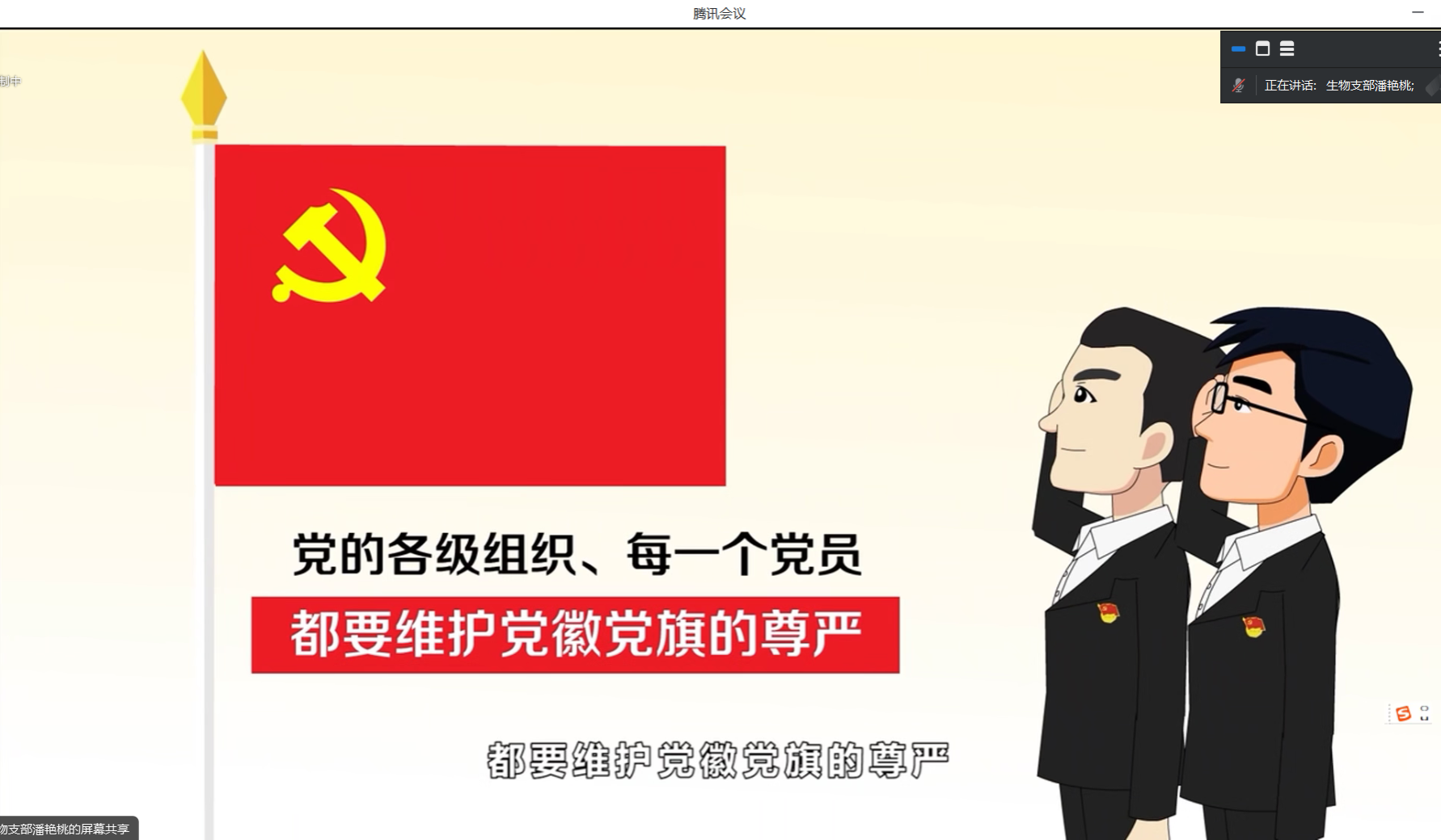会议的最后,潘艳桃同志播放“党徽党旗条例解读”视频,希望青年党员正确认识党徽党旗的深刻内涵,自觉规范使用党徽党旗及其图案。