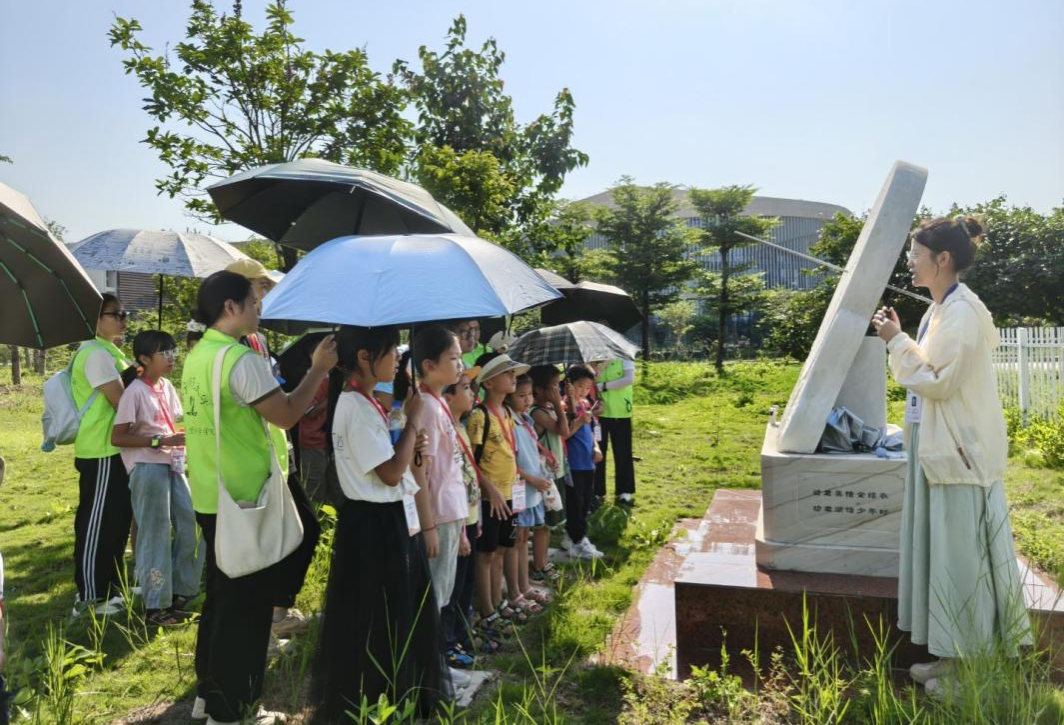 活动首站来到气象园。这里的日晷和星象仪等仪器,成为了小朋友们认识古代人类智慧的生动教材。他们专注地聆听讲解员介绍日晷的组成、作用及工作原理,了解到利用日晷计时是人类在天文计时领域的重大发明,且这一发明被沿用了几千年。