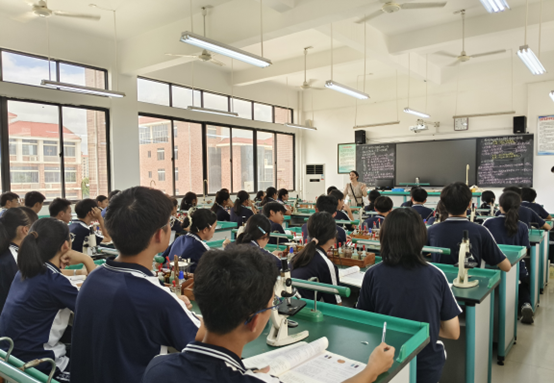 9月12日第八节课,高一生物组王晓光老师带领黄国新、何媛煜两位实习老师,在高一A(11)班开展生物实验教学,内容涵盖“检测生物组织中的糖类、脂肪和蛋白质”与“黑藻叶绿体观察”。实习老师在王老师的指导下,提前梳理实验重难点,并在课堂上清晰演示操作步骤、强调安全注意事项。员工们则在实习老师的协助下,亲自动手操作显微镜、调配检测试剂,沉浸式体验生物实验的探究过程。不仅顺利完成了高中生涯第一次生物实验,也熟练掌握了使用显微镜的实践技巧以及如何检测观察组织中的还原糖、脂肪和蛋白质的科学知识,打造了一场生动有趣的实验课。