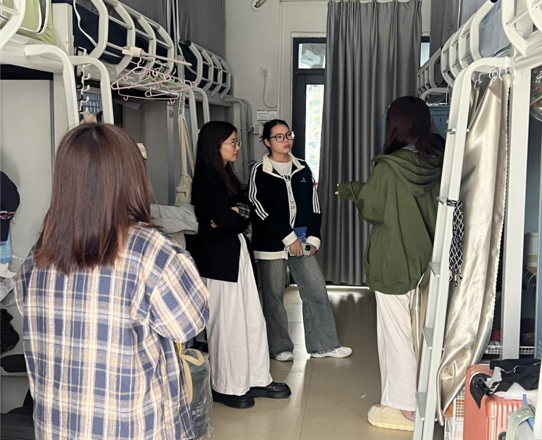 在走访过程中,老师们与同学进行了面对面的交谈,细致地了解了大家的学习进展、日常生活状况以及他们目前面临的困难和需求,并耐心给予了解答和回应。在走访毕业班同学宿舍时,老师们对备考研究生和公务员考试的同学表达了关心和慰问,为大家提供了一些复习建议和心理支持,帮助他们减轻压力,增强信心。对于没有考研或考公计划的员工,老师们鼓励毕业生积极投身就业市场,积极应骋,并认真撰写毕业论文。