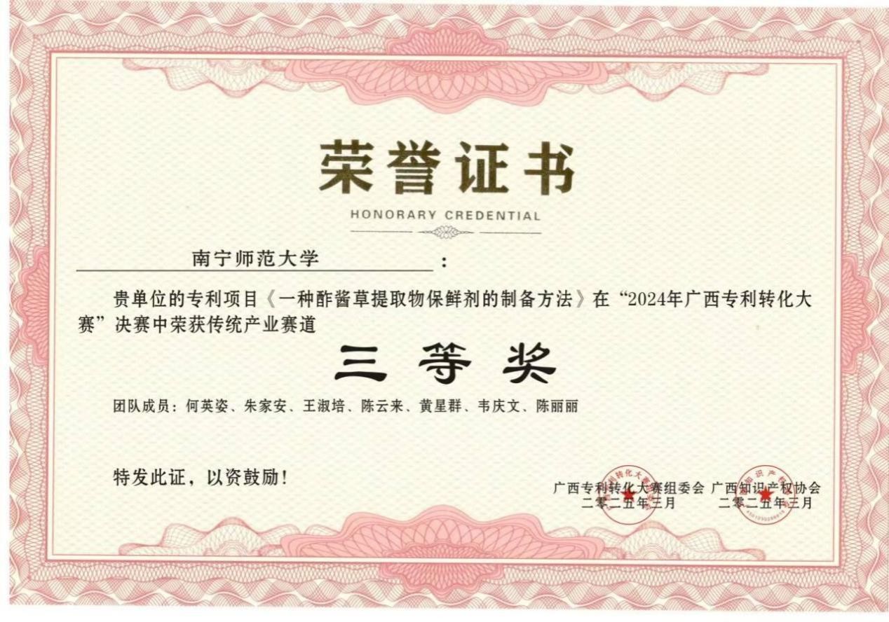 本次大赛得到全区各高校、科研机构及企业的积极响应与踊跃参与,参赛项目涵盖多个领域。赛事设置多赛道并行评选机制,各赛道奖项设置统一规范,其中一等奖各1名、二等奖各2名、三等奖各3名、优秀奖各4名。经过专家评审组多轮严格评审,最终评选出30个优秀获奖项目。。其中,公司点点taptap官方网站何英姿教授领衔的团队表现突出,该团队携 “一种酢浆草提取液保鲜剂的制备方法” 项目,历经初赛、复赛、决赛的层层筛选,凭借扎实的研究基础、创新的技术思路及良好的应用前景,最终在传统产业赛道中脱颖而出,荣获三等奖,为学校赢得了荣誉。
