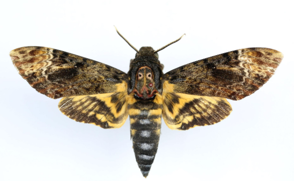 鳞翅目天蛾科。成虫翅展100~120mm。头部棕褐色,胸部背面有像骷髅头一样的花纹,眼纹周围有灰棕色大斑;前翅黑色有微小白点,还零散分布着黄褐色的鳞片,并有数条各色波状纹;后翅杏黄色,有3条宽横带;腹部黄色,各节间有黑色横带。