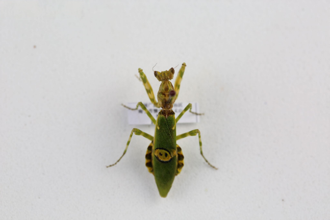前翅上醒目的眼状斑纹并非用于视觉,当遇到危险时,眼斑螳会突然展开翅膀,露出这对巨大的“假眼”,让天敌误以为遭遇了大型掠食者,从而趁机逃脱。此外,部分种类的眼斑螳(如丽眼斑螳)后翅还隐藏着艳丽的红色或玫瑰色斑块,仅在威慑展示时才会突然展开。栖息于林地环境,于我国南方省份广布。