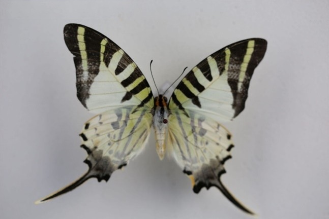 翅膀背面是淡雅的黄白色,一旦合拢却会展现出迷人的黄绿色彩,如同换上了一套“隐身衣”。它们翅膀末端那对细长的尾突,好似佩带着两把精致的“宝剑”,因此拥有了“仗剑走天涯”的潇洒美名。更有趣的是,这对“宝剑”对于绿凤蝶至关重要,一旦受损可能会影响其飞行甚至生存。分布于广东、广西、香港、越南、印度、泰国、锡金、马来西亚等。