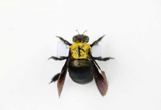它们会用强有力的上颚在枯木中开凿出长达14厘米的分枝型隧道,唾液混合木屑制成的巢室隔板能有效防潮,内壁光滑如釉,这种特殊构造能承受幼虫发育所需的湿度;雌蜂产卵时会用树脂加固巢室,幼虫孵化后依靠成虫储存的蜂粮成长,这使它们能在朽木中完成从卵到成虫的蜕变。此外,雄蜂虽无蜇针,却会通过振翅恐吓驱赶入侵者;雌蜂遇危险时才会用蜇针防御,刺痛程度远轻于普通蜜蜂。分布于我国大部分地区。