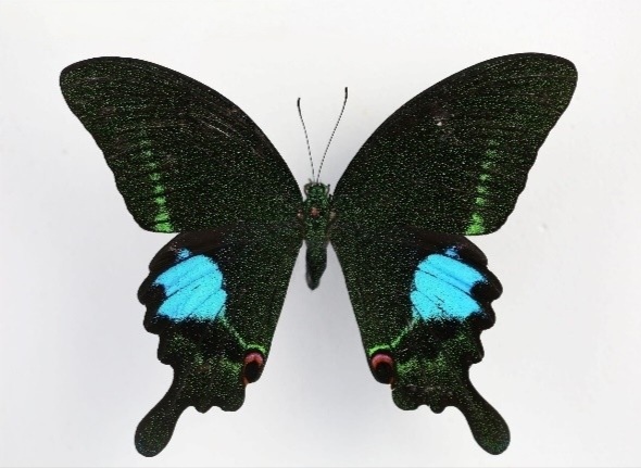 鳞翅目凤蝶科。翅表散布金绿色鳞片,后翅正面有大块的金属蓝色斑块,蓝斑与后翅内缘间有金绿色细丝纹相连。后翅反面外缘具有新月形红斑,还有一个明显的叶状尾突,看起来像一条小尾巴。