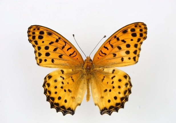 鳞翅目蛱蝶科。雄蝶翅膀正面是鲜艳的橙黄色,没有区分性别的特殊标记;雌蝶前翅上有一条倾斜的白色带子。不管是雄蝶还是雌蝶,后翅反面的底色都很斑驳,没有均匀统一的颜色易与其他豹蛱蝶区分。